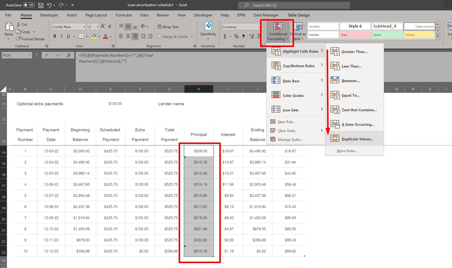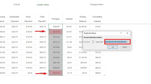 3.จากนั้นข้อมูล Cell ไหน มีข้อมูลซ้ำกัน จะขึ้นไฮไลท์สีแดง เพื่อให้เราได้เห็น